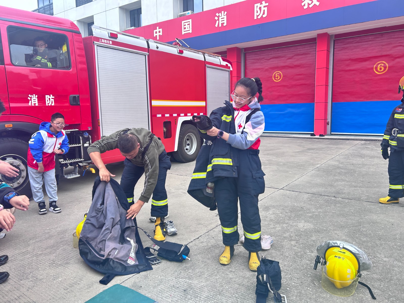 消防服的每一寸都透露着对安全性能的极致追求,从头盔到防火靴,每一处细节设计都旨在确保消防员在执行任务时的生命安全。在消防员的示范讲解指导下,孩子们纷纷试穿消防服,试戴消防帽,瞬间化身为一个个“小小消防员”,亲身感受消防员执行任务时的辛苦和严谨,也进一步体会到消防员们的不易。