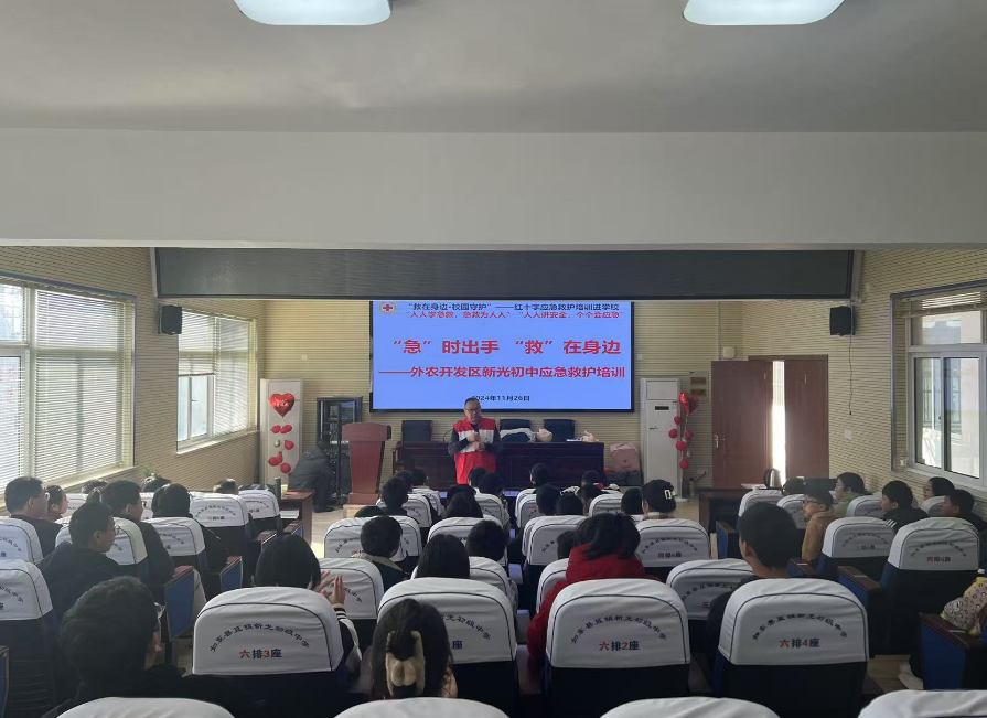11月26日下午,外农区红十字会邀请县红十字周嫒主任、薛老师,何老师来我区新光初中开展应急救护普及性培训。培训内容包括心肺复苏、AED的使用等。99名师生在培训中积极互动,认真学习,既增强了安全意识,又提升了应急救护能力,让学生能够更好地应对可能发生的灾害,保护自己和他人的生命安全。