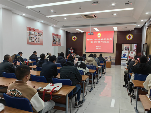 今年12月是江苏省第八个无偿献血宣传月。12月7日,南通市红十字会举办了礼敬“双献”志愿者专场公益性应急救护技能培训班。当天,无偿献血者、造血干细胞捐献志愿者和志愿者家属共计43人免费参加了培训。