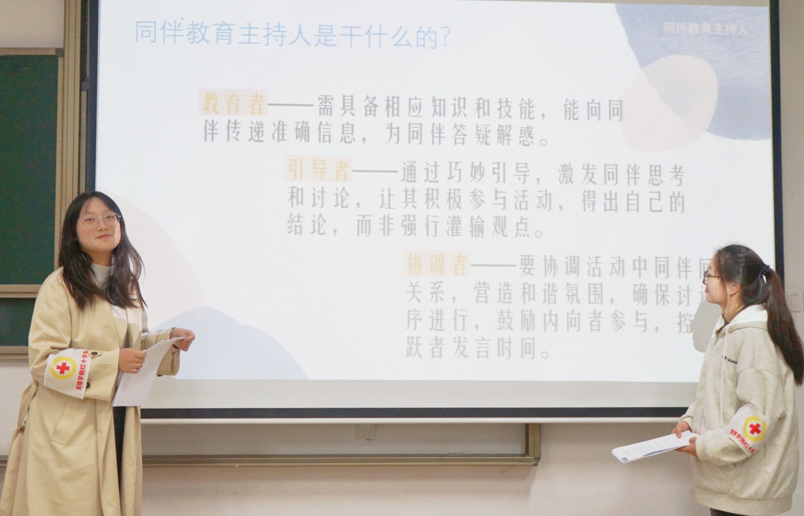 “青年健康同伴教育主持人”是由无锡市红十字会在高校学生中定向培养的宣传力量,是致力于传播“人道、博爱、奉献”红十字精神的红十字志愿者。同伴教育活动,侧重于态度的讨论和技能的培训,主持人的角色不是老师,而是话题讨论的引导者,启发大家就共同关心的话题提出建议。“红十字青年健康同伴教育”不仅应用在应急救护、生殖健康和艾滋病预防领域,还可以应用在心理健康、反对物质成瘾和校园暴力等方面。