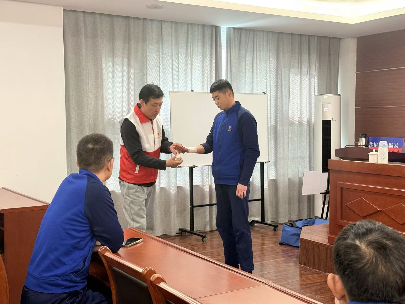救护培训老师详细讲解演示了心肺复苏、自动体外除颤器(AED)的使用、海姆立克急救、创伤救护等急救知识和技能,还专门结合消防部队灭火救援现场的特点和需要,传授了针对突发事件、意外伤害的现场避险逃生与自救互救技能,官兵们也在培训老师的指导下进行模拟演练,进一步加深了救护要领与基本技能的掌握,均通过严格的理论考试和实操考核的学员并获得“红十字救护员”资格证书。