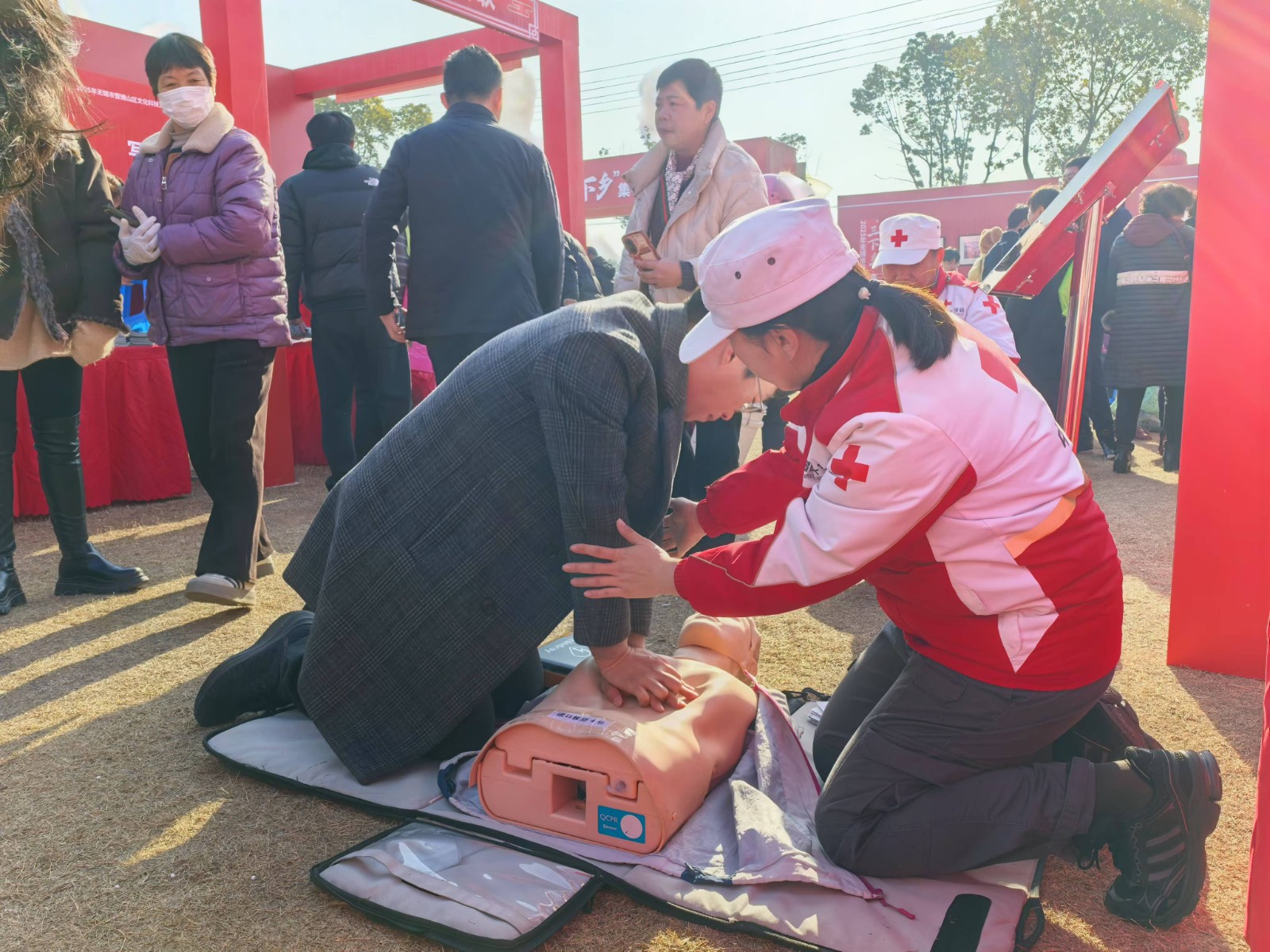 活动现场,在市红十字会的摊位展示区,醒目的应急救护知识宣传展板整齐排列,急救知识宣传普及区、自救互救技能体验区亦是人头攒动。红十字应急救护师资们为现场群众宣讲应急救护、无偿献血、造血干细胞捐献等知识,发放应急救护技能普及读本和“三献”宣传折页等资料,演示心肺复苏术等自救互救技能,现场群众纷纷驻足观摩,踊跃参与实操体验。参加体验的村民们纷纷赞叹道:“应急救护知识很实用,关键时刻能救命,在农村这方面的知识普及较少,感谢红十字会给我们上了生动直观的一课”。此次活动,市红十字会还向羊尖镇捐赠了价值2.5万元的健康包和棉被等物资。
