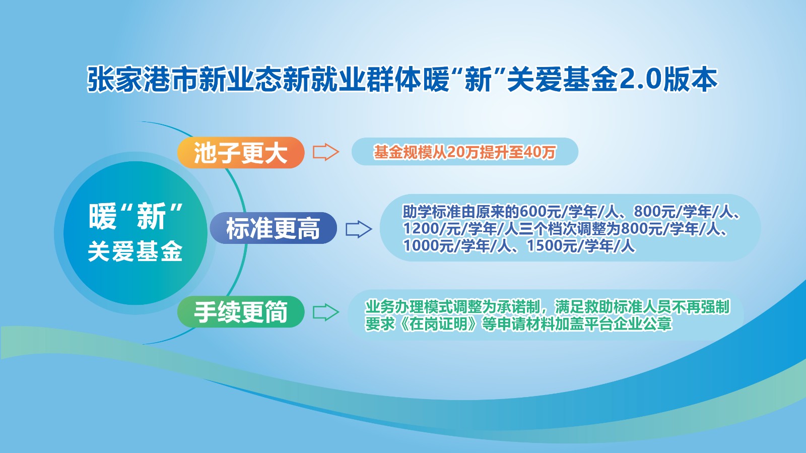 现场还发布了张家港市新就业群体关爱基金2.0版本。2023年,市红十字会在苏州大市率先面向新就业群体推出暖“新”关爱基金,提供大病救助、助学、急难型临时救助三项服务。今年,为进一步提升服务效能,聚焦“池子更大、标准更高、手续更简”,市红十字会全面升级暖“新”关爱基金2.0版本,将基金规模从20万提升至40万;助学标准由原来的600元/学年/人、800元/学年/人、1200/元/学年/人三个档次调整为800元/学年/人、1000元/学年/人、1500元/学年/人;业务办理模式调整为承诺制,满足救助标准人员不再强制要求《在岗证明》等申请材料加盖平台企业公章。
