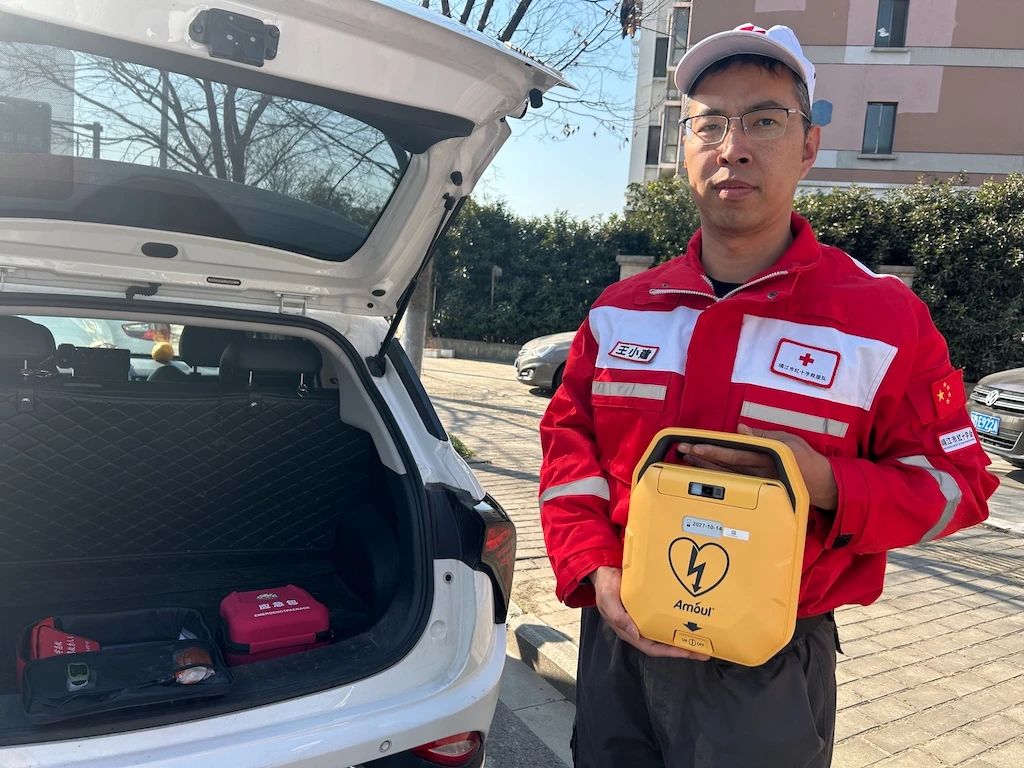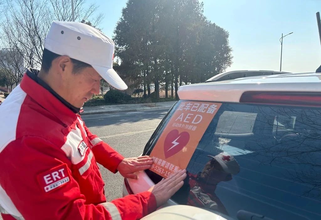 AED是一种便携式、易操作的急救设备,用于患者心跳骤停后的早期除颤,可帮助患者恢复心脏跳动,适合非医护人员在紧急状态下使用。靖江市已在商场、公园、学校、乡镇为民服务中心等地配备了多台AED,方便群众实施救援。“当车上配备AED时,就能让‘救命神器’移动起来,方便随时进行急救。”市红十字救援队副队长华洪军常年参与应急救护培训及公益救援行动,深知心脏病突发的危害,以及因抢救不及时而无法挽回生命的遗憾,因此他决定购置一台AED常备在车内,以备不时之需。王小建、陈钟、程荣林等也相继加入。