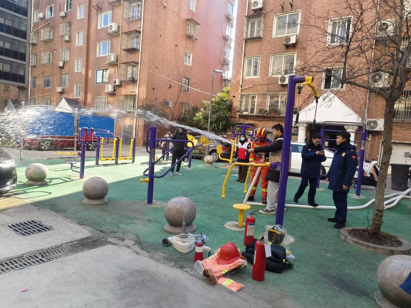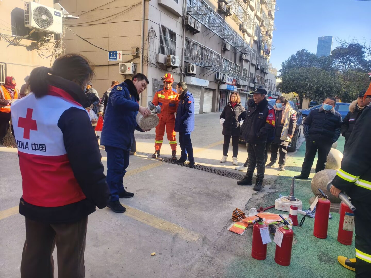 活动伊始,特勤消防救援站的王嘉珺首先给大家讲解了小区微型消防站器材的配备标准,以及社区红十字会工作人员在遇突发事件时应采取的应急措施,确保在突发状况下能够高效、安全地发挥作用。在随后的现场演练环节,王嘉珺首先讲解消防灭火器的使用要点及方法,就灭火器使用四步法“一提、二拔、三瞄、四压”进行实际操练。随后,志愿者在王嘉珺的指导下,为现场的物业、小区居民演示消火栓内水带、水枪的连接及开关消防水阀门,使大家熟悉操作方法,避免遇到突发情况时束手无策。现场人头攒动,大家积极互动。