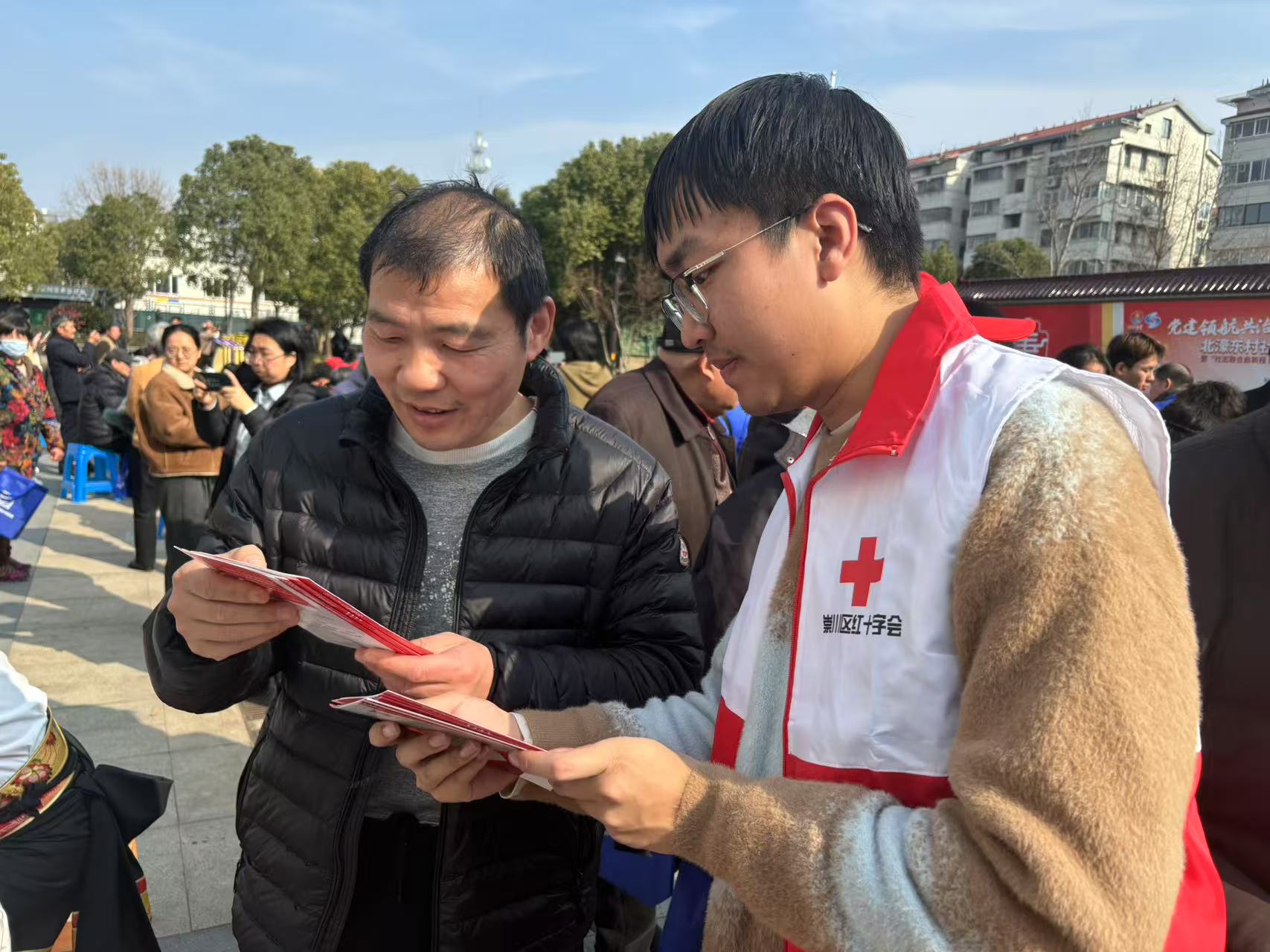 活动现场,医护人员为社区居民提供免费血压、血氧检测及健康咨询服务,耐心解答居民关于慢性病管理、春季养生等问题。针对老年群体常见的健康疑虑,医务人员结合检测数据提出科学建议,引导居民增强健康管理意识。在活动现场,同步开展红十字知识普及工作,志愿者们通过发放应急救护指南、人道救助政策解读等宣传手册,向居民普及急救技能、造血干细胞捐赠流程及公益救助渠道。