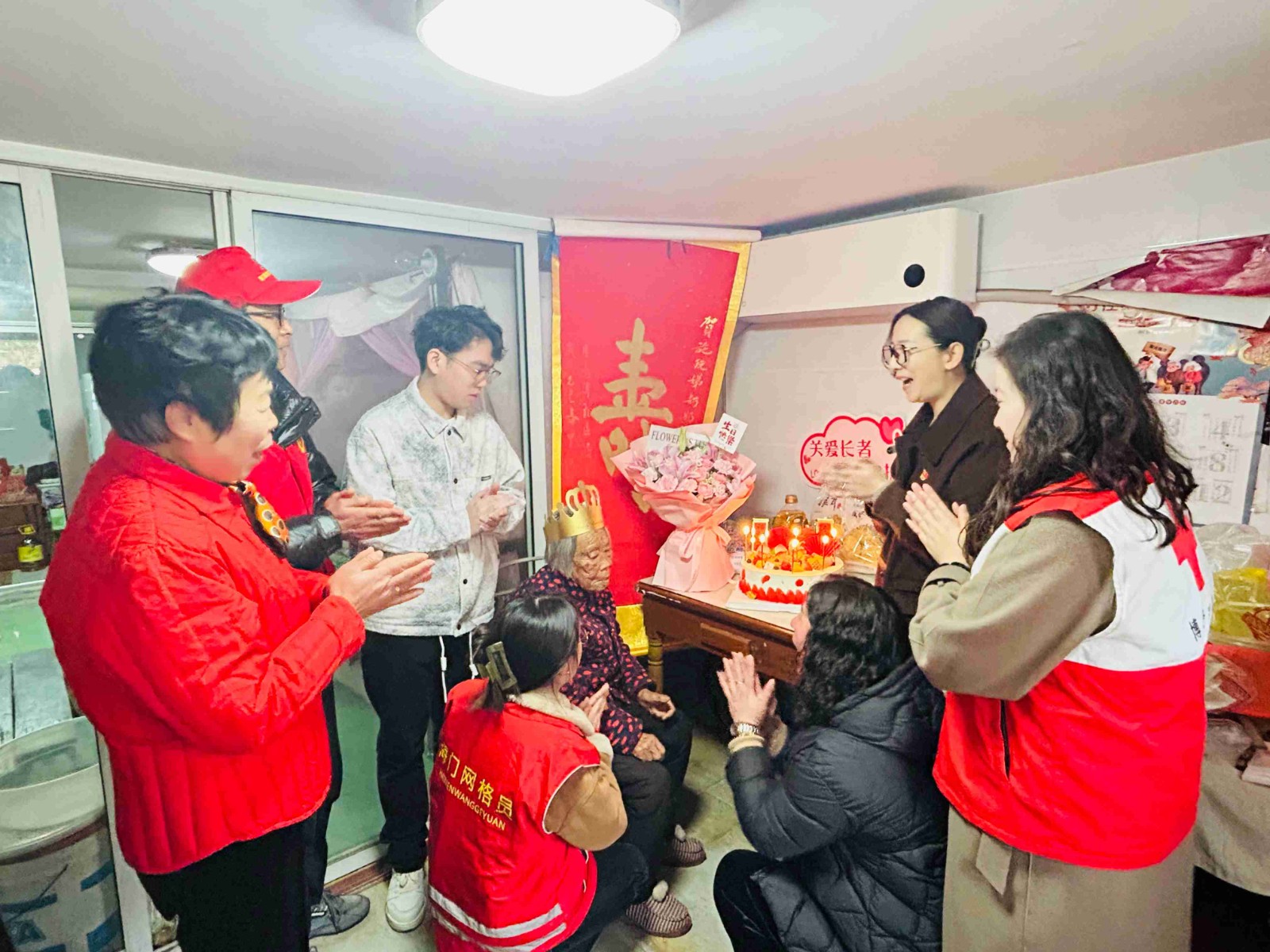 月亮湾社区红十字会站长蔡燕握着老人的手,仔细询问老人的生活习惯、健康状况和饮食情况,祝愿老人生活幸福、健康长寿并送上鲜花和米油等慰问品;馨爱公益组织志愿者为老人送上“寿”字挂联和生日蛋糕。施奶奶目前是社区最高寿的老人,月亮湾社区站长蔡燕表示,“家有一老,如有一宝”,老人的健康长寿、幸福快乐不仅是老人自己的福气,更是家庭、社区的福气,叮嘱老人要保重身体,嘱咐老人的家属要悉心照顾好老人的生活,让老人安享晚年,如果有什么困难,可以随时跟网格员和社区反映。一直陪伴在老人身边的儿媳非常感激,连声道谢。