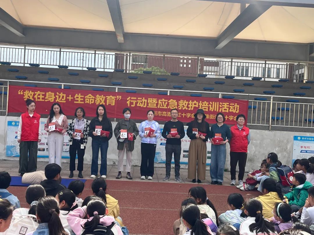 活动伊始,明珠街道红十字会首先将《市民安全救护手册》和急救包赠送给学校和五年级各班,助力校园应急体系建设。每个应急包中包含外伤出血、骨折、擦伤扭伤等各类急救用品,满足了日常急救需求,为守护师生安全健康增添了一份有利保障。