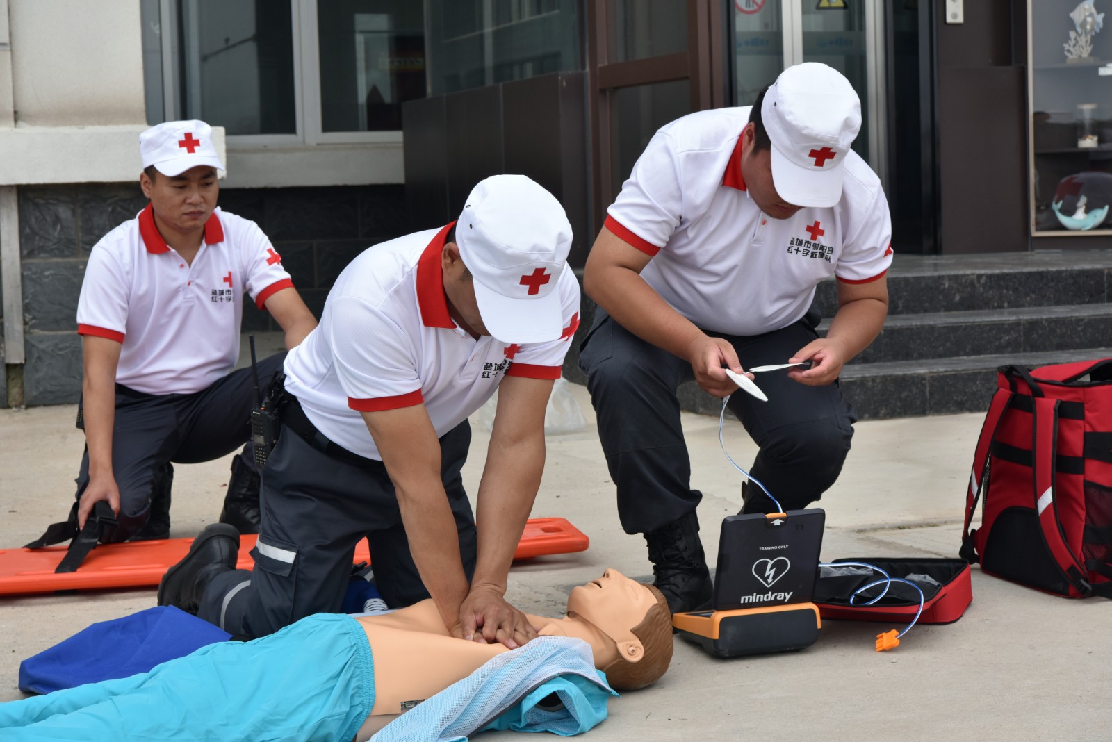 “指挥部,指挥部,我是射阳红十字救援队队长吴刚,我们接到指令已到达现场,现场有三名急需处置的受伤人员,分别为心跳骤停、头部出血和腿部骨折,现正在抓紧救援处置,汇报完毕!”