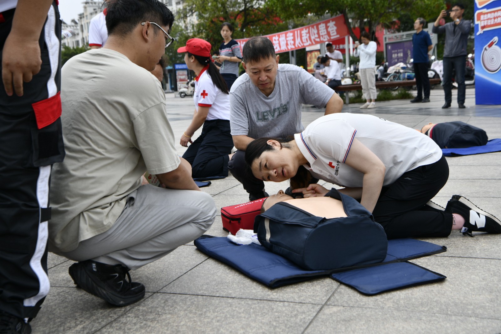 位于广场南侧的演练实操展示区内挤满了人,8个人体模型整齐排列,红十字志愿者正手把手指导市民练习心肺复苏。“双手重叠,掌根放在患者两乳头连线中点,手臂要垂直,按压深度5厘米。”在志愿者反复指导下,市民李浩成功掌握了标准操作流程,他感慨道:"按压频率要每分钟100至120次,实际操作起来才知道力度和节奏这么讲究。