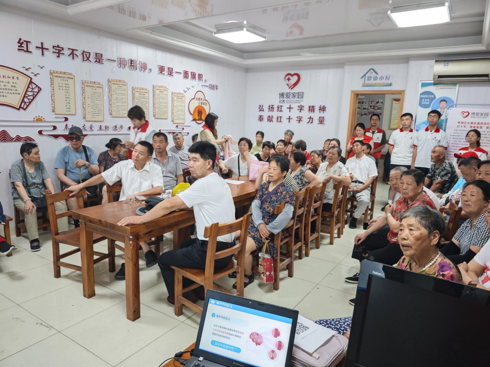 荣中祥目前就职于盐城市红十字会医院(文峰街道社区卫生服务中心),任慢病科主任,同时也是文峰街道西苑社区红十字“博爱家园”日常公益活动的主要负责人。7月5日一大早,荣中祥就将“博爱家园”活动室内的空调开到26℃,通过社区广播、微信群就开始“摇人”,7点钟,20多个老爹爹老奶奶们来到了现场。荣中祥这次邀请到南京医科大学红十字会“千村万户健康行‘初心向党’行动”大学生暑期志愿服务队队员们、盐城市第三人民医院护理部主任单红兰为银龄群体送洒夏日“健康清凉”。