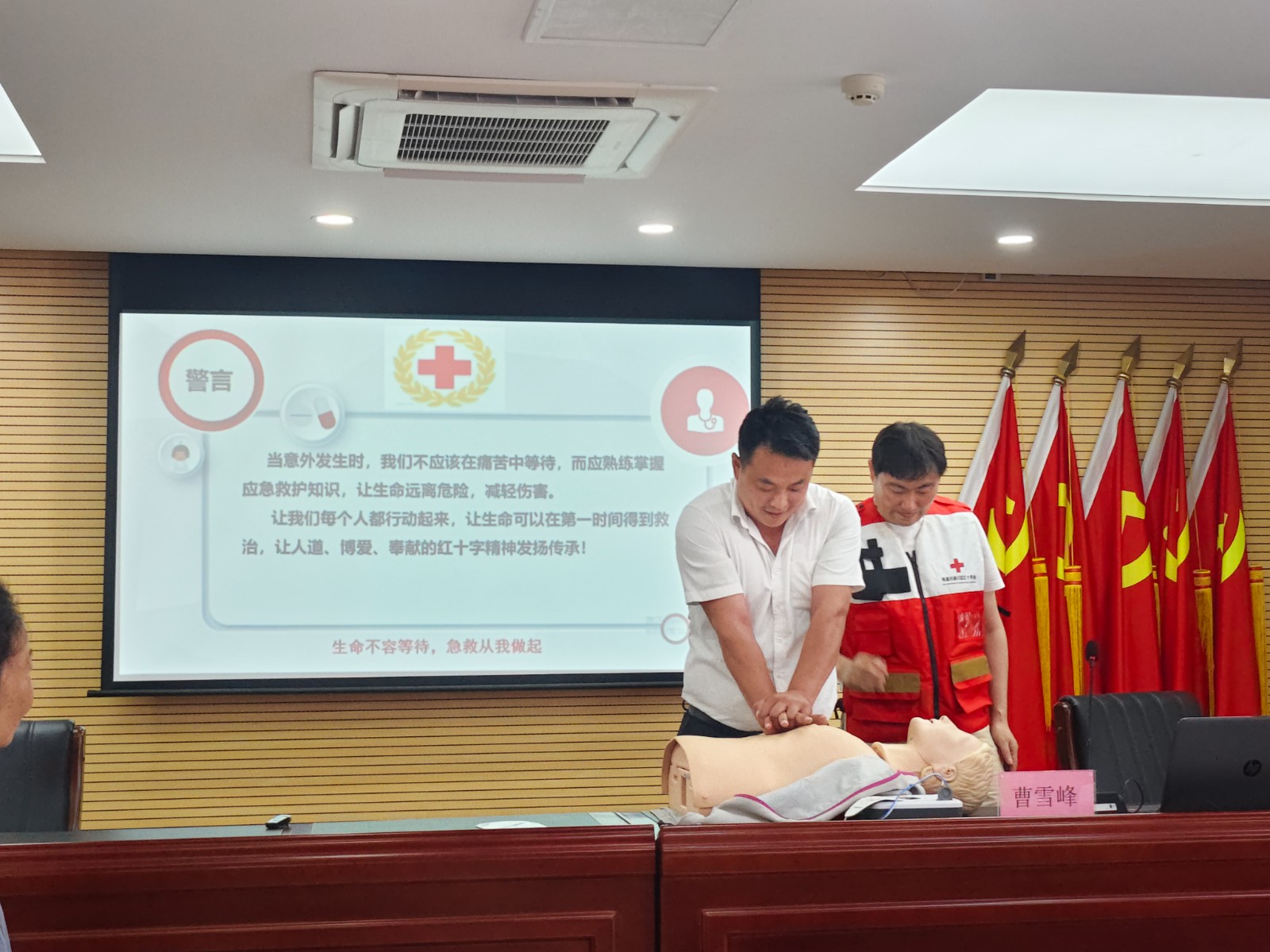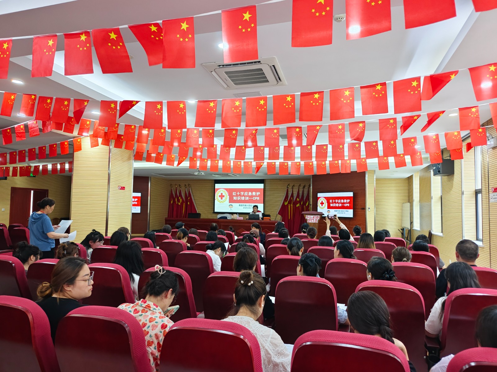 筑牢安全意识,响应生命号召。活动利用午休时段为辖区幼儿园教师、物业工作人员等百余名代表 “充电”,通过理论教学与实操训练结合的方式,系统传授心肺复苏(CPR)与体外除颤仪(AED)使用、气道异物梗阻急救(海姆立克法)、常见意外伤害等急救知识。切实提升重点行业人员的应急处置能力,为生命安全网络筑牢基石。