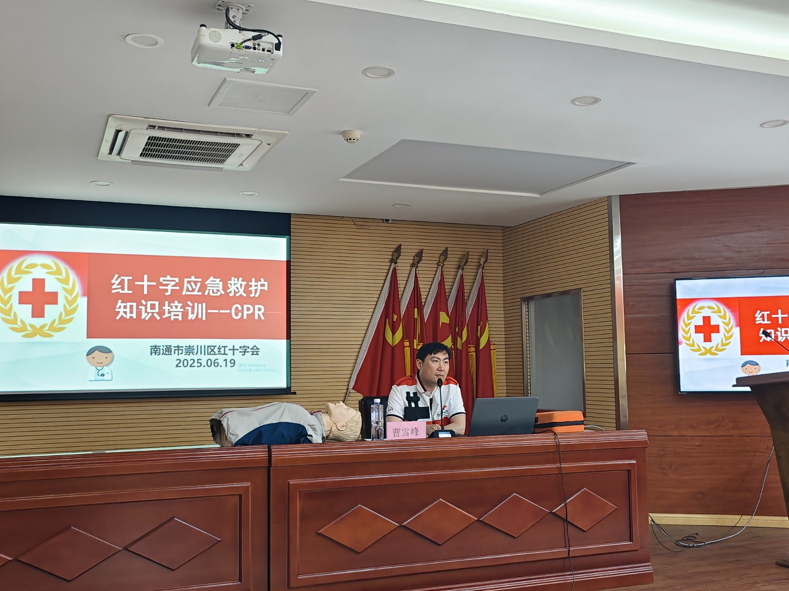专业引领教学,理论实践交融。培训现场,崇川区卫健委人事科科长曹雪峰担任主讲。曹科长以 “案例解析 + 流程拆解” 的模式展开理论授课,结合近年来公共场所突发急救事件实例,深入浅出地讲解心脏骤停的黄金抢救时间窗等核心知识。实操环节中,曹科长利用医学模拟教具进行标准化演示:胸外按压需定位两乳头连线中点,以 “手臂垂直、深度 5-6 cm(成人至少5cm不超过6cm,儿童至少为胸部前后径的1/3(儿童大约是5cm )、频率 100-120 次 / 分钟”的规范操作;AED 使用强调 “开机听指令、除颤贴片、远离患者” 三步骤,特别提醒 “金属异物接触”“湿身环境” 等禁忌场景。学员们分组使用模拟人进行按压练习,在一对一指导下纠正手势角度、按压深度等细节,现场形成 “观摩 - 实操 - 纠错 - 强化” 的高效学习闭环。