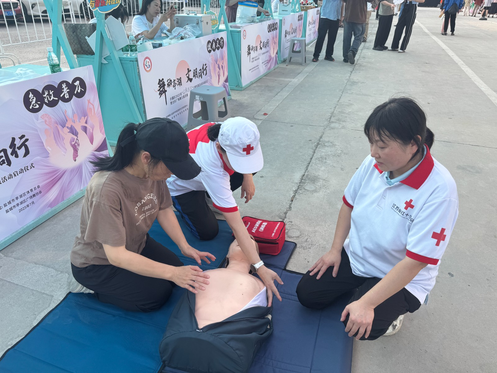 7月10日傍晚,亭湖区“点亮星夜”文明实践活动启动仪式暨全区广场舞大赛决赛在建军路竹林大饭店西侧广场举行,红十字会5名应急救护培训师资早早就来到现场,既为活动提供应急救援保障服务,又设点开展救护知识和技能宣传培训,吸引市民驻足参加学习。