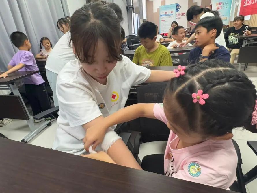 青少年课堂聚焦技能深度与社会责任。在深入阐释“三救三献”意义、传授常见伤害处理及高效报警技巧后,活动核心落在“技能实战”。青少年们实操止血包扎,并通过模型与视频深入学习心肺复苏与AED的操作原理,深刻理解“黄金救援4分钟”的要义。针对学龄前儿童,活动突出趣味互动与意识启蒙。志愿者将抽象的安全知识化入图文并茂的绘本故事,烫伤、割伤、防溺水等要点在共读讨论中变得鲜活。孩子们更是拿起画笔,将学到的急救知识、安全标识转化为充满童真的“安全防护”主题画作。在志愿者引导下,他们小心翼翼地进行模拟伤口处理包扎,通过模型初步认识“救命神器”。