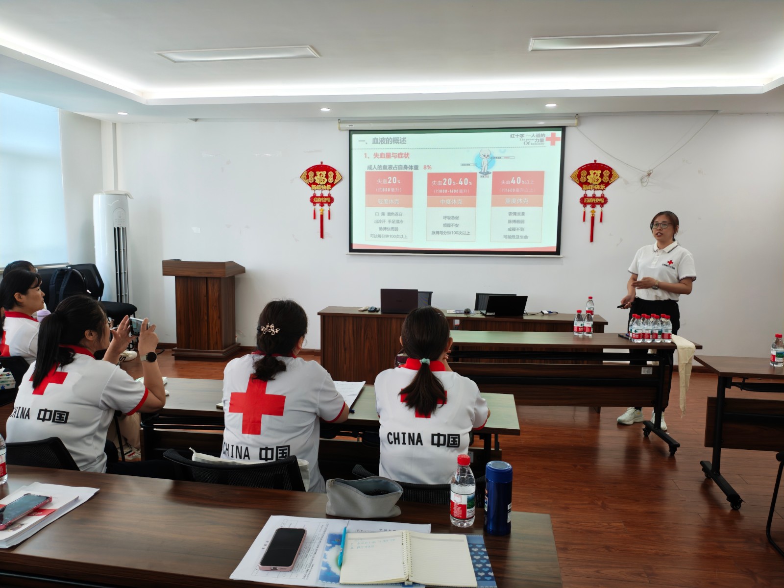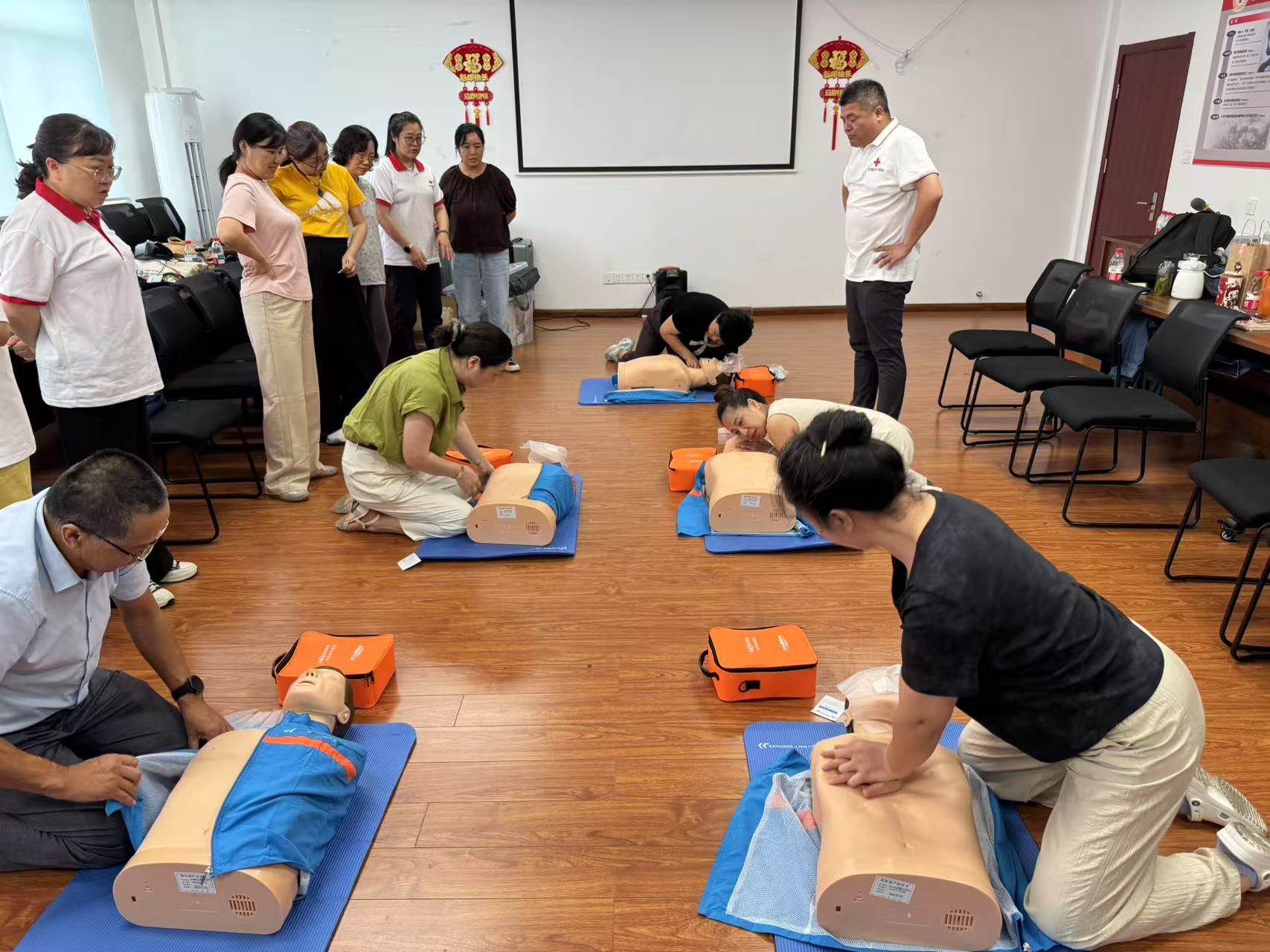 培训现场,省红十字会培训专家王龙、薛花、吴季红凭借扎实的专业功底和丰富的实践经验,围绕应急救护的核心理念与关键技术,为学员们带来了一场内容详实、讲解生动的专题培训。专家们通过理论讲解、案例分析与实操演练相结合的方式,帮助学员系统掌握现场急救的基本流程与关键技能。培训过程中,学员们积极参与互动,现场学习氛围浓厚,教学效果显著。