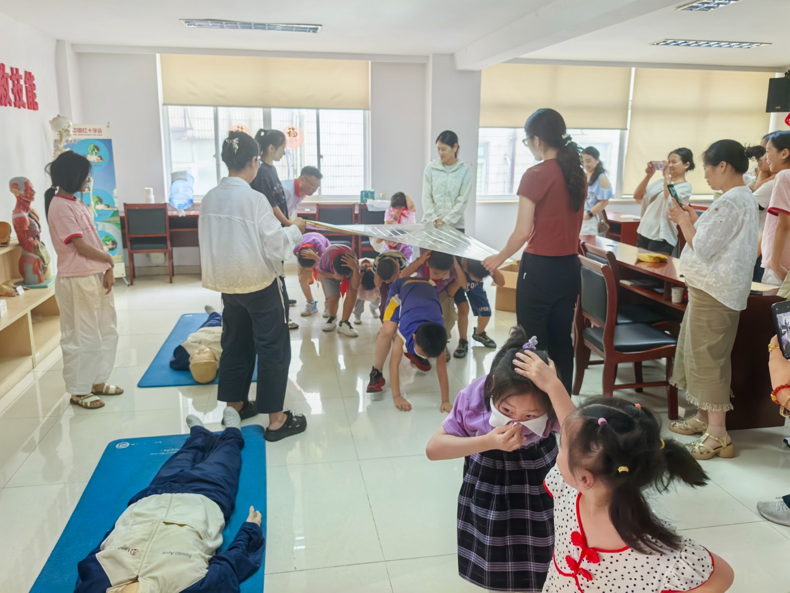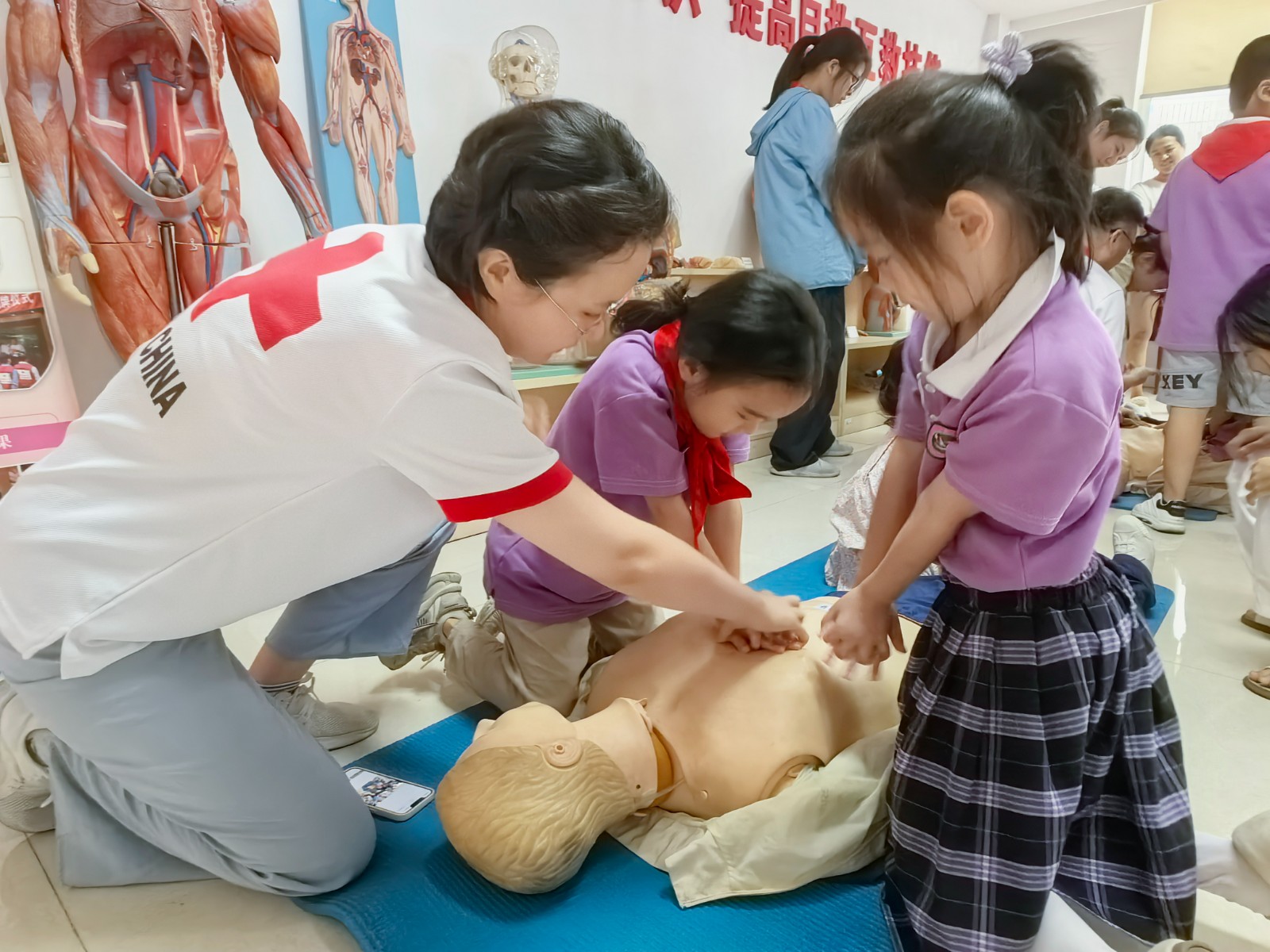 活动通过课程讲解、视频观摩、互动问答、情景演练等丰富的形式开展,主要介绍了溺水的表现、危害以及如何预防和应对,青少年暑期日常急症的自救互救等内容,并组织小朋友们开展了气道异物梗阻的处理、心肺复苏的体会操作和紧急避险措施的演练。