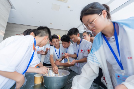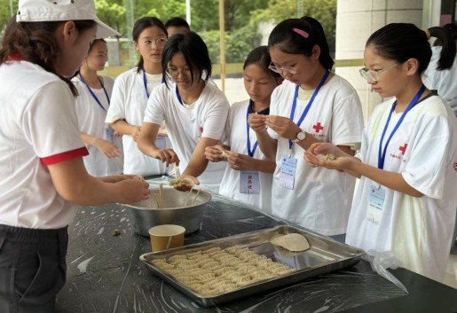 夏令营的午餐时光同样充满乐趣。午餐时分,同学们围在一起,跟着红十字救援队员学包水饺。当热腾腾的水饺出锅,品尝着自己亲手制作的美味,那份成就感与幸福感萦绕心头。