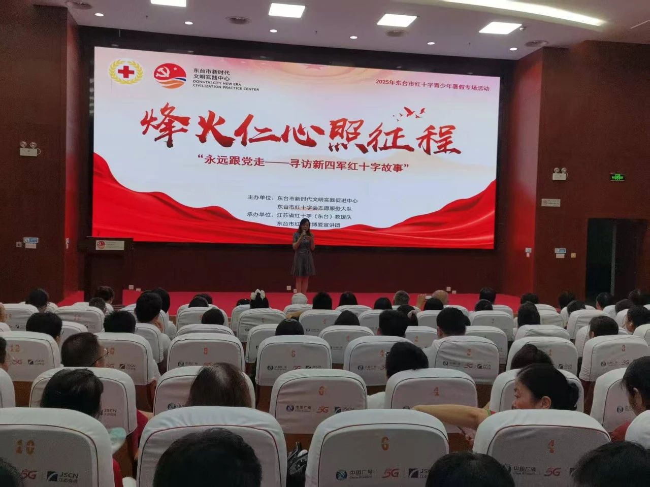 2025 年是中国人民抗日战争暨世界反法西斯战争胜利 80 周年。8 月 7 日晚,由东台市红十字会、市新时代文明实践促进中心联合主办的“点亮星夜”主题“烽火仁心照征程 ——永远跟党走·寻访新四军红十字故事” 2025年东台市红十字青少年暑假专场活动,在实践中心大讲堂举行。红十字青少年、志愿者、社会公众等近200人参加此次活动。