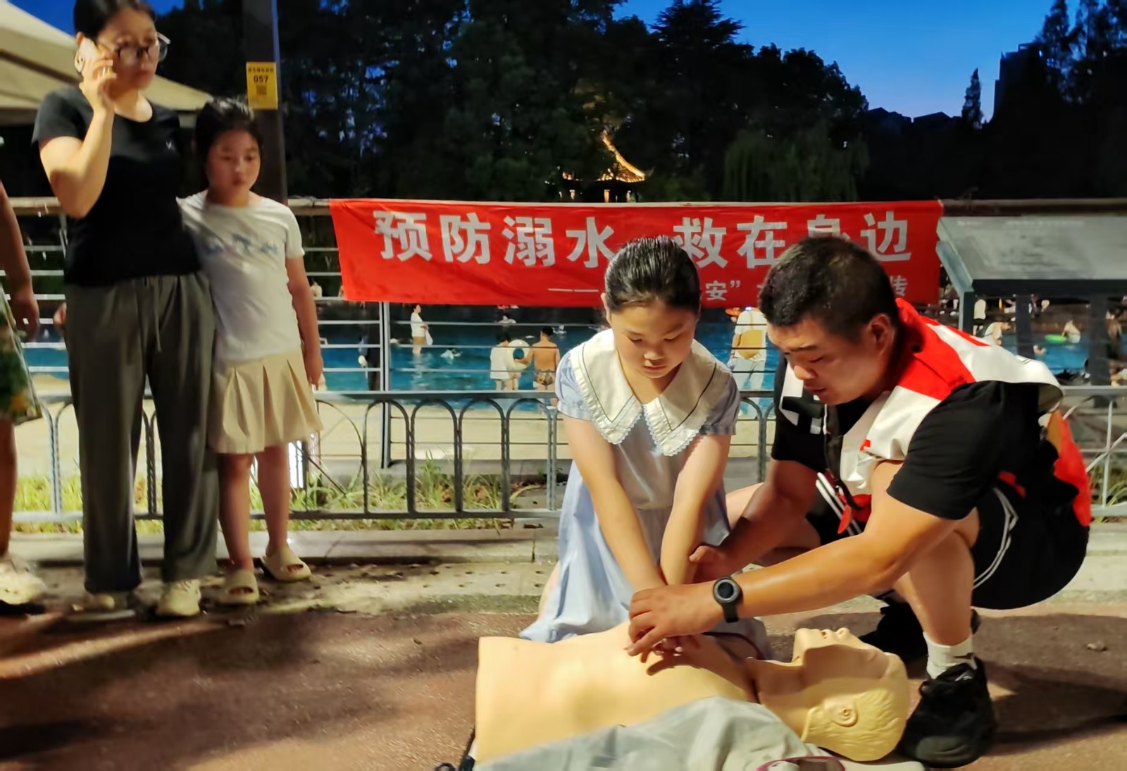 为提升市民应急能力,救护队员利用模拟人演示心肺复苏操作,分步骤讲解按压位置、力度和频率等关键要点。吸引众多在场的家长和小朋友踊跃参与实操练习,救援队员一对一指导纠正动作。“暑假带孩子玩水多,学了急救技能心里更有底了!”一位参与体验的家长表示。